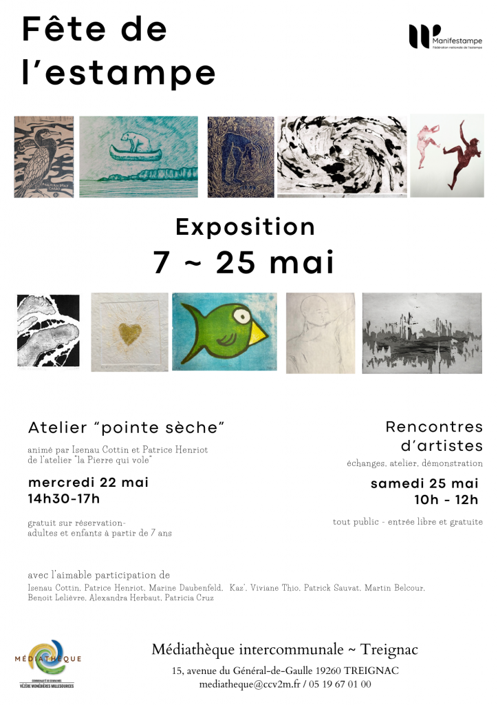 Venez découvrir la nouvelle exposition à la médiathèque de Treignac jusqu’au 25 mai ! Deux rendez-vous à ne pas manquer : l’atelier « pointe sèche » le mercredi 22 mai et des rencontres d’artistes le samedi 25 mai.