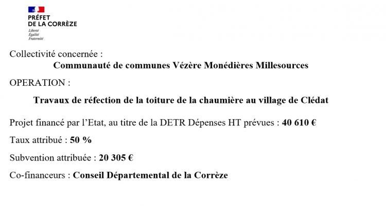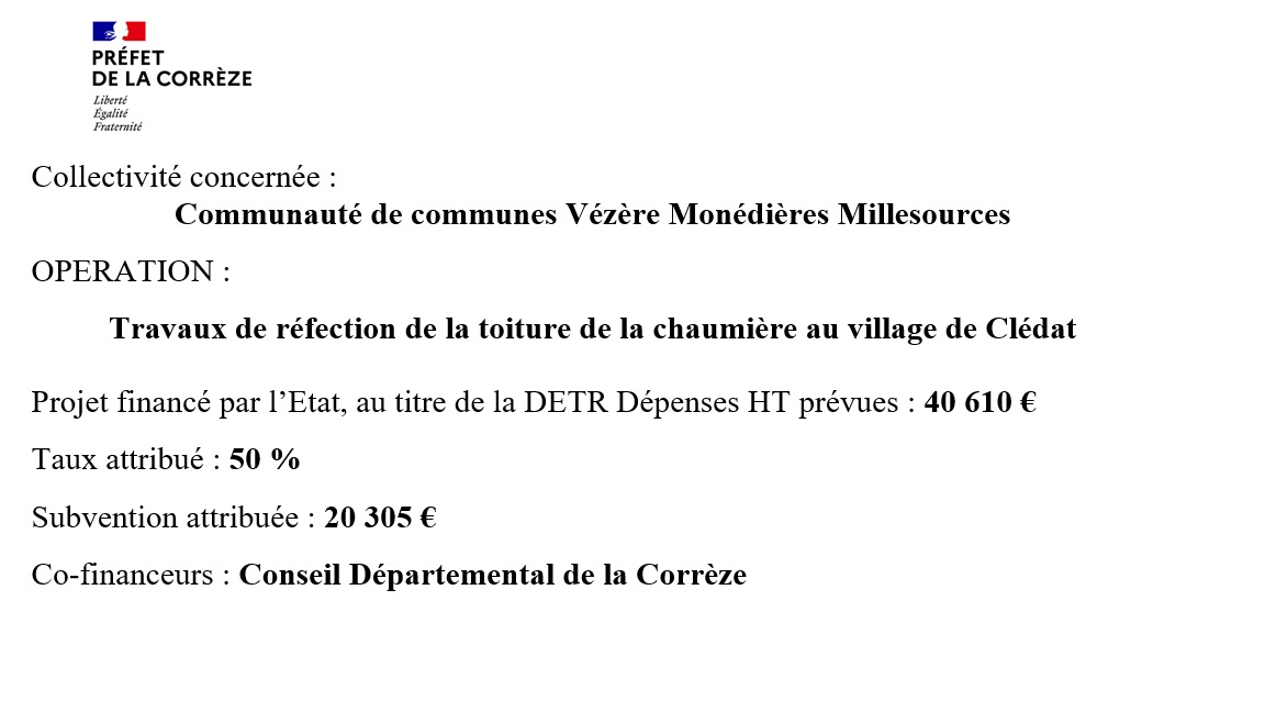 Grâce au soutien de la Préfecture de la Corrèze dans le cadre de la DETR (Dotation des Equipements des Territoires Ruraux) et du Conseil Départemental de la Corrèze dans le cadre de l’Aide aux Communes, la Chaumière va pouvoir être restaurée.