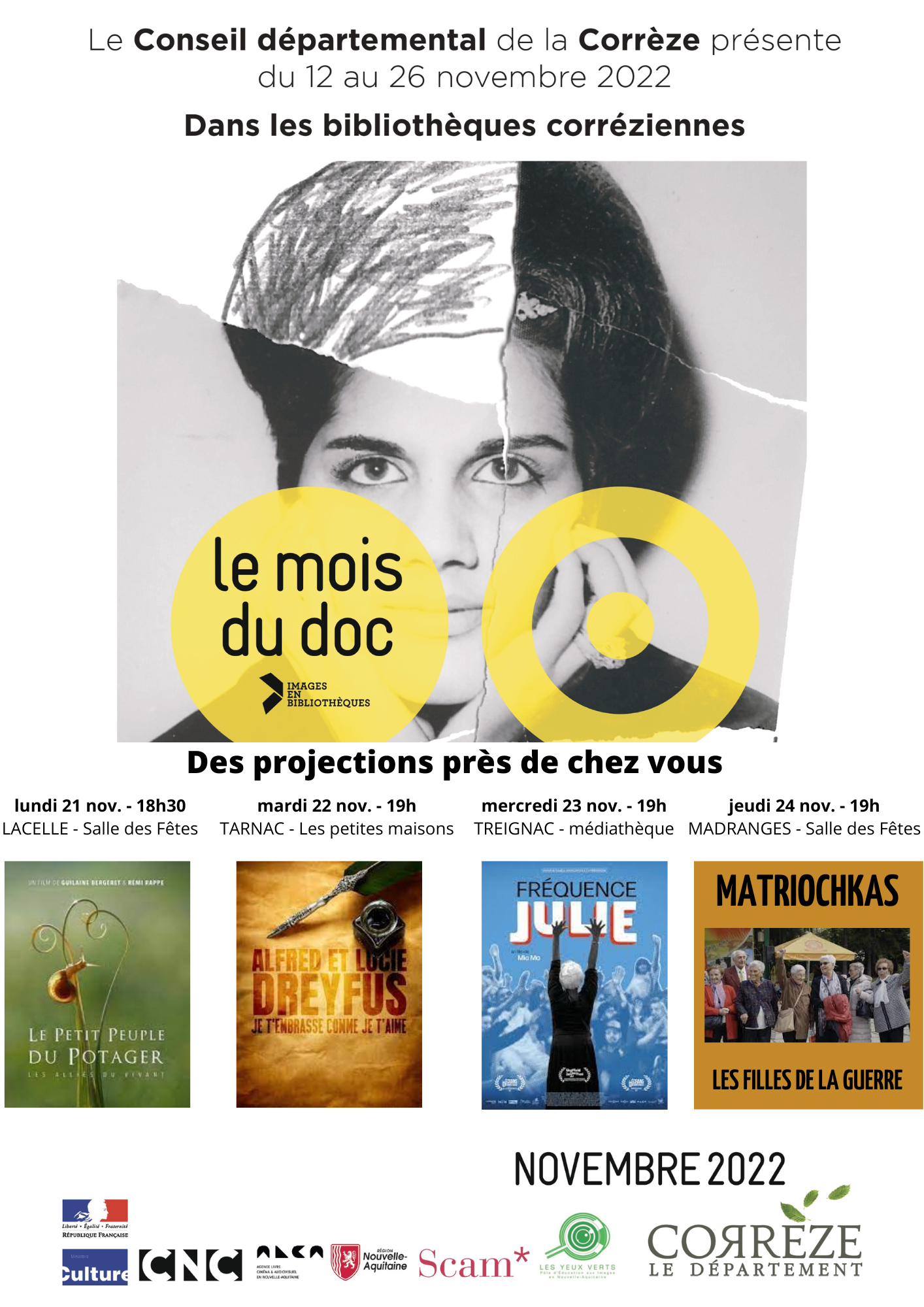La semaine prochaine, la médiathèque participe au mois du film documentaire, avec des projections à Lacelle (lundi 21 novembre – 18h30), Tarnac (mardi 22 novembre – 19h), Treignac (mercredi 23 novembre – 19h) et Madranges (jeudi 24 novembre – 19h).
