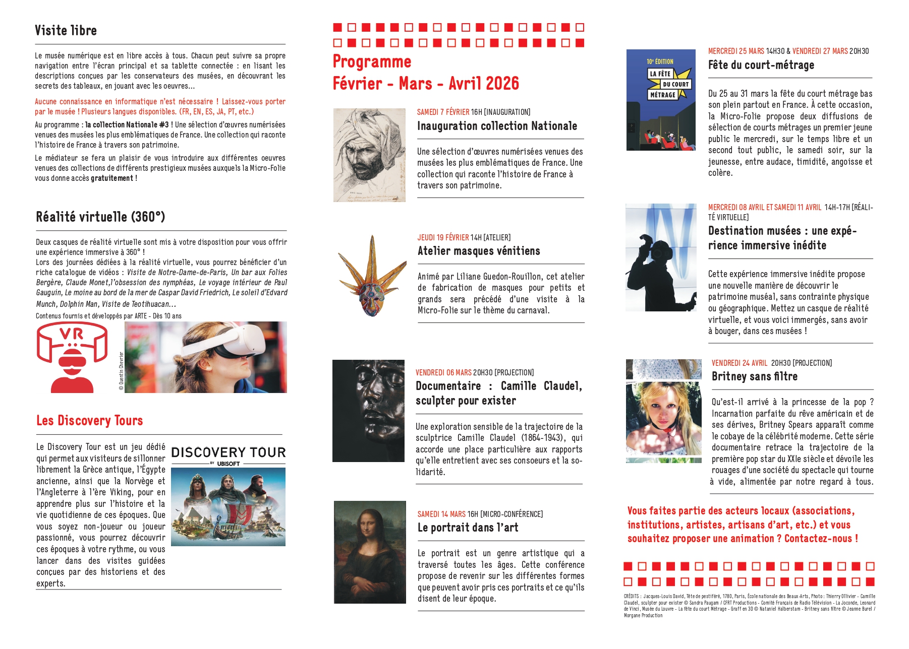 Diverses projections vous attendent (documentaires, fête du court-métrage), une micro-conférence sur le portrait dans l’art mais aussi un atelier masques vénitiens en partenariat avec la médiathèque
