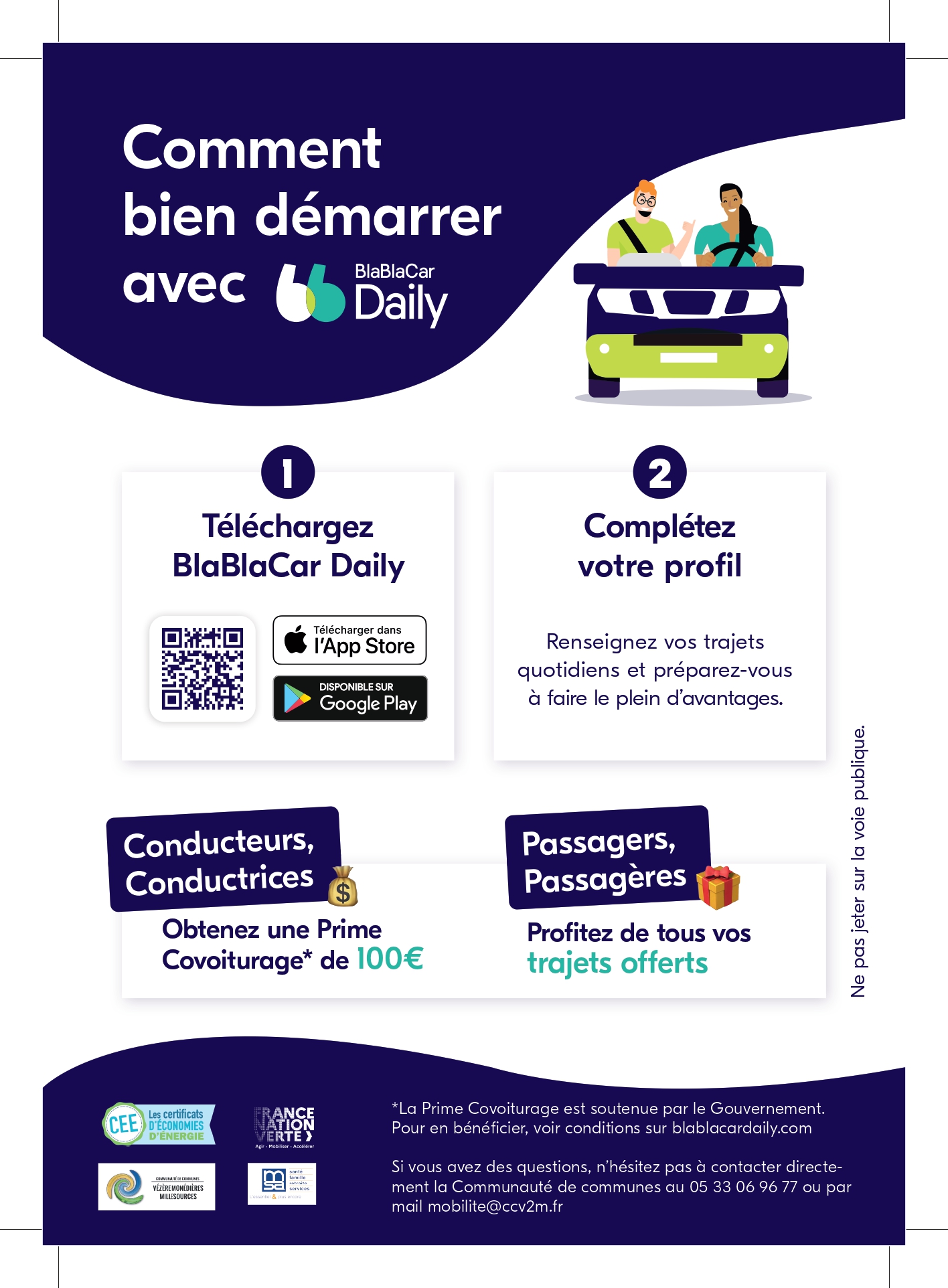 Pour participer, il suffit de réaliser vos trajet en utilisant l’application de covoiturage BlablaCarDaily, au départ ou à la destination d’un adresse dans une commune de notre Communauté de Communes.