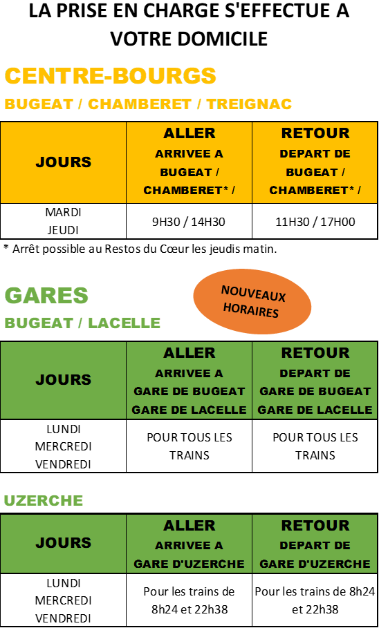 Une offre de navette à la demande vous est proposée sur l’ensemble du territoire de la Communauté de Communes Vézère Monédières Millesources. Elle vous permet de rejoindre 6 arrêts : les centres-bourg de Bugeat, Chamberet et Treignac mais aussi les gares de Bugeat, Lacelle et Uzerche que ce soit pour aller prendre un train ou pour revenir chez vous.